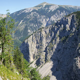 Mit Susi von der Bergstation der Raxseilbahn (1547 m) über den "Praterstern" (1624 m) zur Höllentalaussicht (1520 m). Dann hinab zur Dirnbacher-Hütte (1477 m) und jenseits wieder hinauf zum Kloben-Törl (1650 m). Entlang der Lechner-Mauern zur Bärengrube und nach einer kurzen Rast auf die Scheibwaldhöhe (1943 m). Danach über den Dreimarkstein (1948 m) und vorbei bei der Raxgmoa-Hütte (1850 m) hinunter zur Seehütte (1643 m).